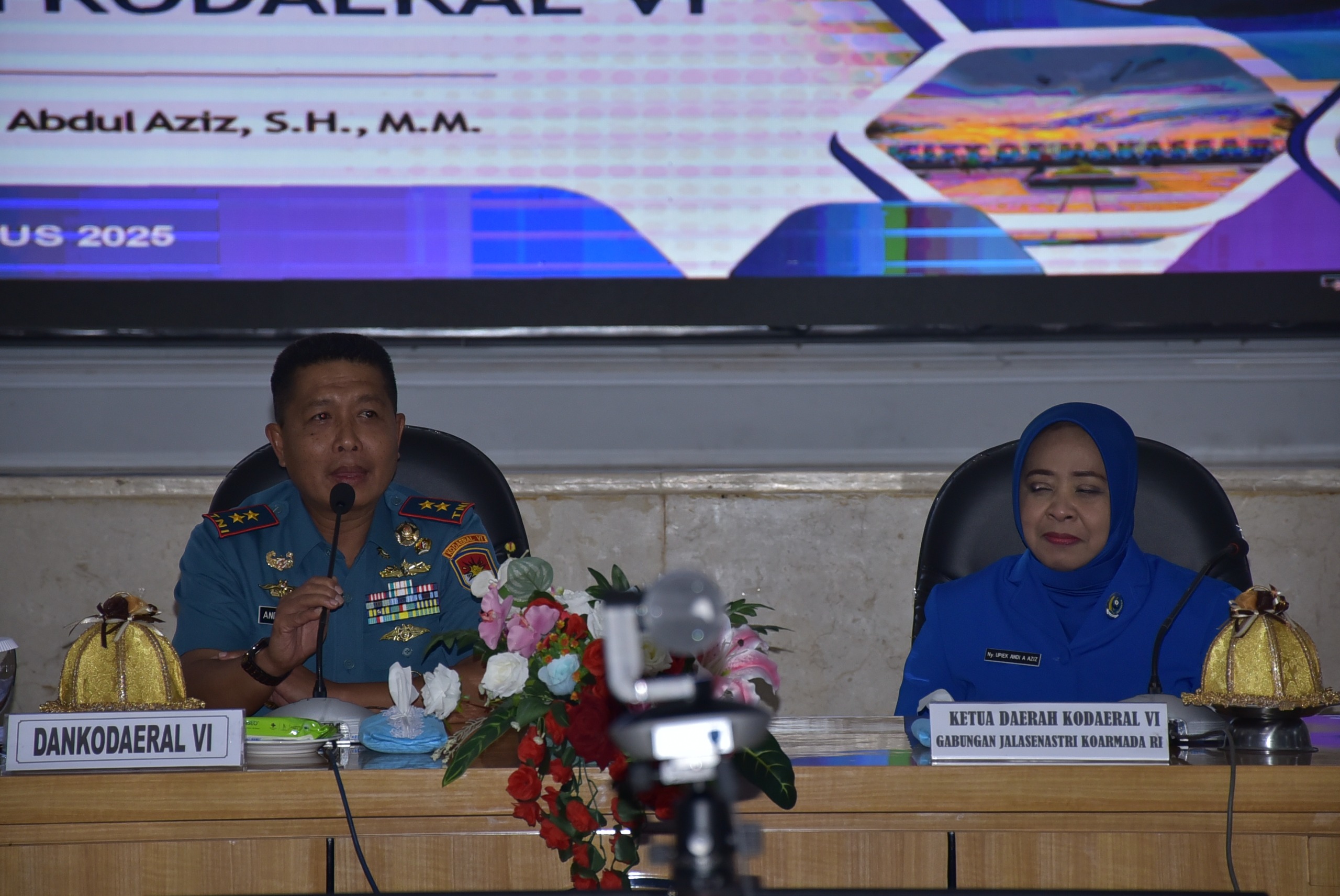 Makassar, Menduduki Jabatan baru sebagai pemegang Tongkat Komando di Kodaeral VI, Komandan Komando Daerah TNI Angkatan Laut VI (Dankodaeral VI) Laksamana Muda TNI Andi Abdul Aziz, S.H., M.M didampingi Ketua Daerah Kodaeral VI Gabungan Jalasenastri Koarmada RI (KDK VI GJK RI) Ny. Upiek Abdul Aziz melaksanakan Entry Briefing kepada seluruh personel Kodaeral VI bertempat di Gedung Sultan Hasanuddin Mako Kodaeral VI, Selasa (19/08/2025).