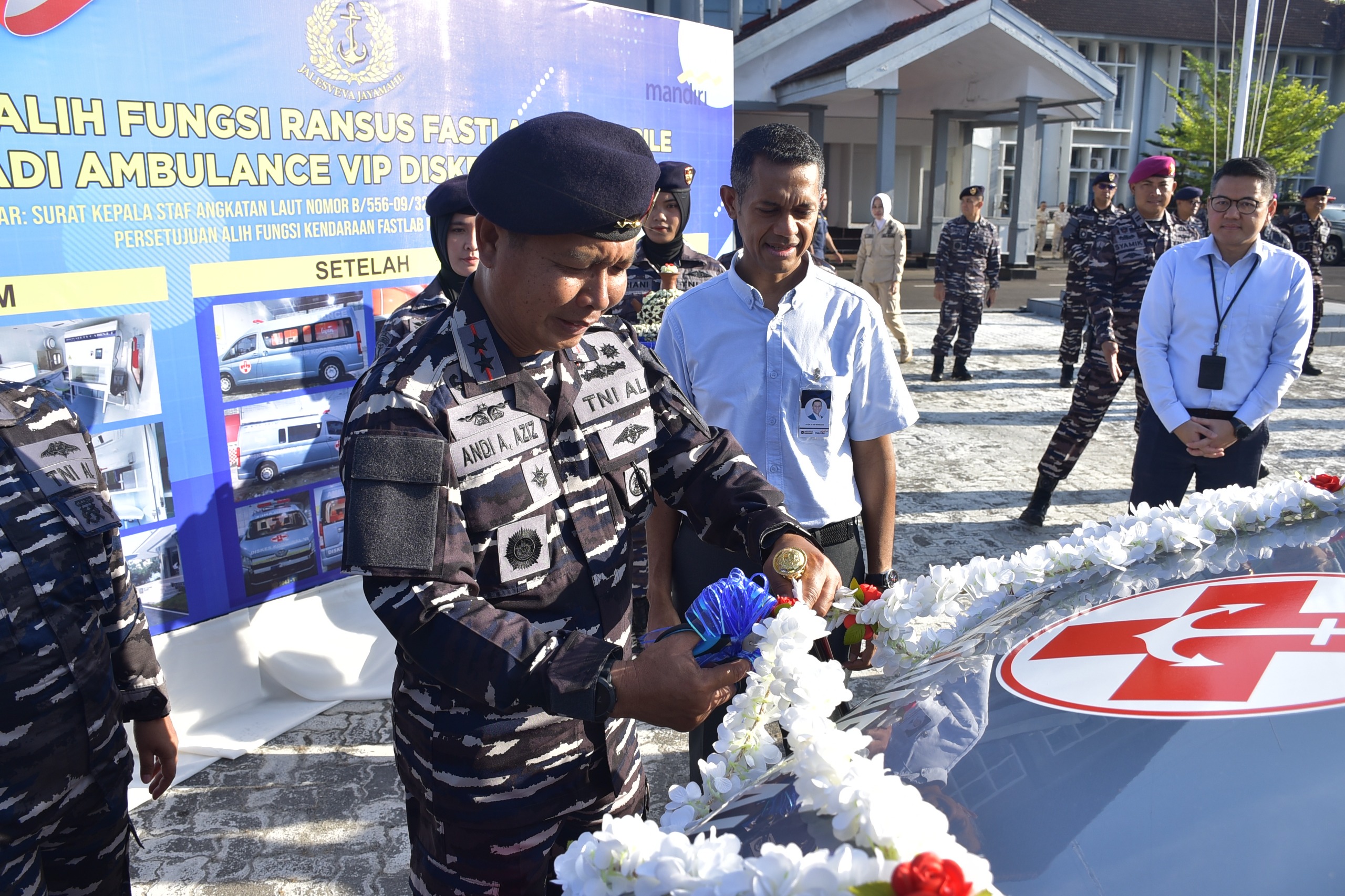 Makassar, Komandan Komando Daerah TNI AL (Kodaeral) VI Laksamana Muda TNI Andi Abdul Aziz, S.H., M.M Meresmikan Hasil Restorasi Interior Ransus Fastlab PCR Mobile Menjadi Ambulance VIP Diskes Kodaeral VI di Lapangan Arafuru Mako Kodaeral VI, Selasa (30/09/2025).