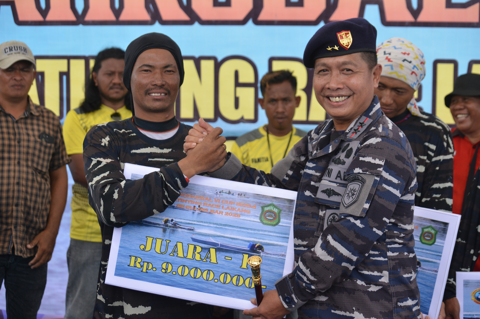 Penyerahan hadiah dilakukan langsung oleh Komandan Kodaeral VI didampingi oleh para pejabat TNI AL dan tokoh masyarakat, diikuti dengan sesi foto bersama dan penampilan budaya khas pesisir yang semakin memperkaya nuansa kebersamaan dan kearifan lokal.