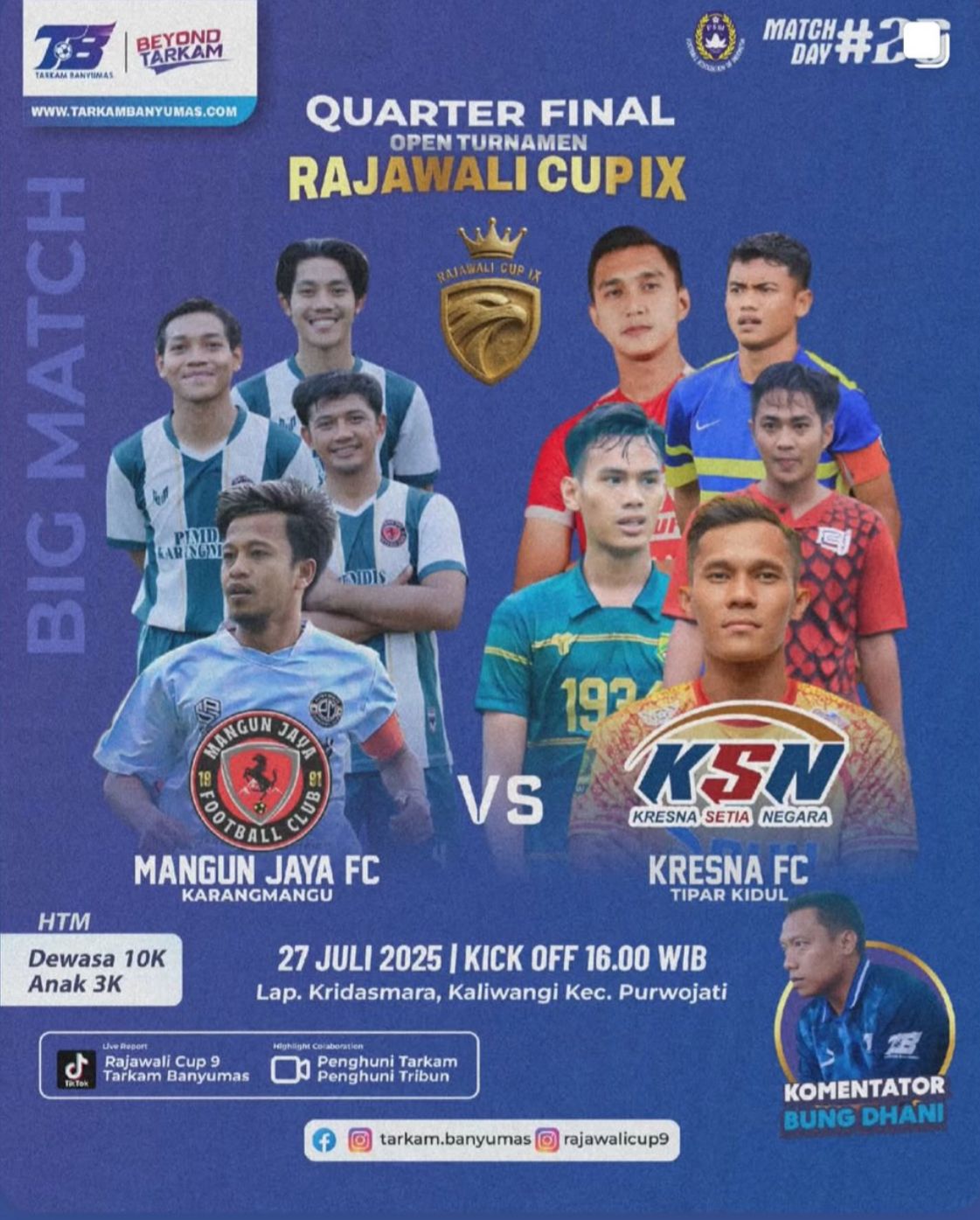 Pertandingan bergengsi ini akan digelar di Lapangan Kaliwangi, Kecamatan Purwojati, pada Minggu (27/07/2025). Kedua tim akan beradu strategi dan kekuatan demi tiket ke semifinal dalam turnamen sepak bola yang penuh gengsi di kawasan tersebut.