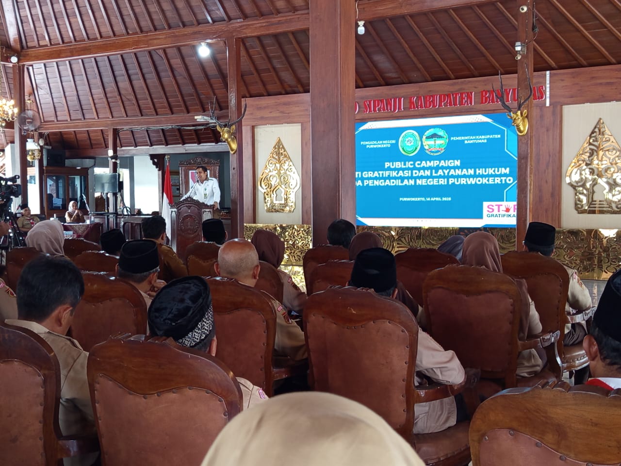 Banyumas – Pengadilan Negeri (PN) Purwokerto, bekerja sama dengan Pemerintah Kabupaten Banyumas, menggelar acara bertema “Public Campaign Anti Gratifikasi dan Layanan Hukum pada Pengadilan Negeri Purwokerto” di Pendopo Si Panji Purwokerto, Senin 14 April 2025.