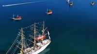 KRI Bima Suci Disambut Kapal Ikonik Makassar “Pinisi” dan Perahu Nelayan Di Makassar