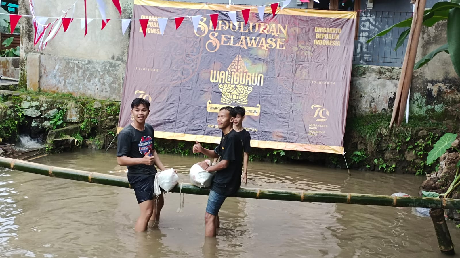 Warga Ajibarang Wetan Meriahkan HUT RI ke-80 dengan Lomba Pukul Guling di Atas Kolam